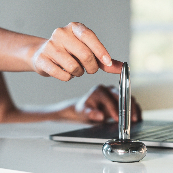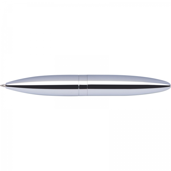 Chromowany długopis z niebieskim, metalowym wkładem i magnetyczną antypoślizgową podstawką.