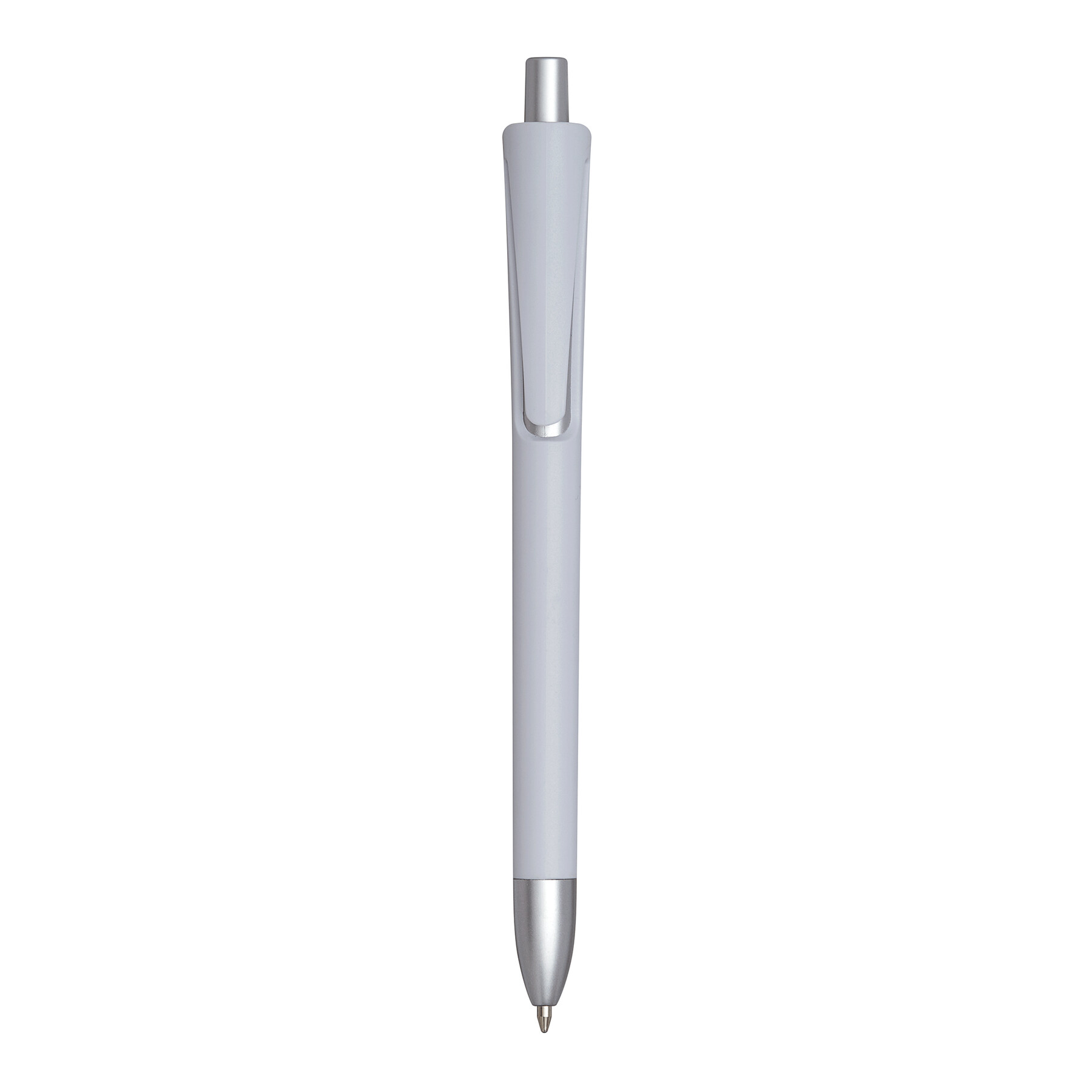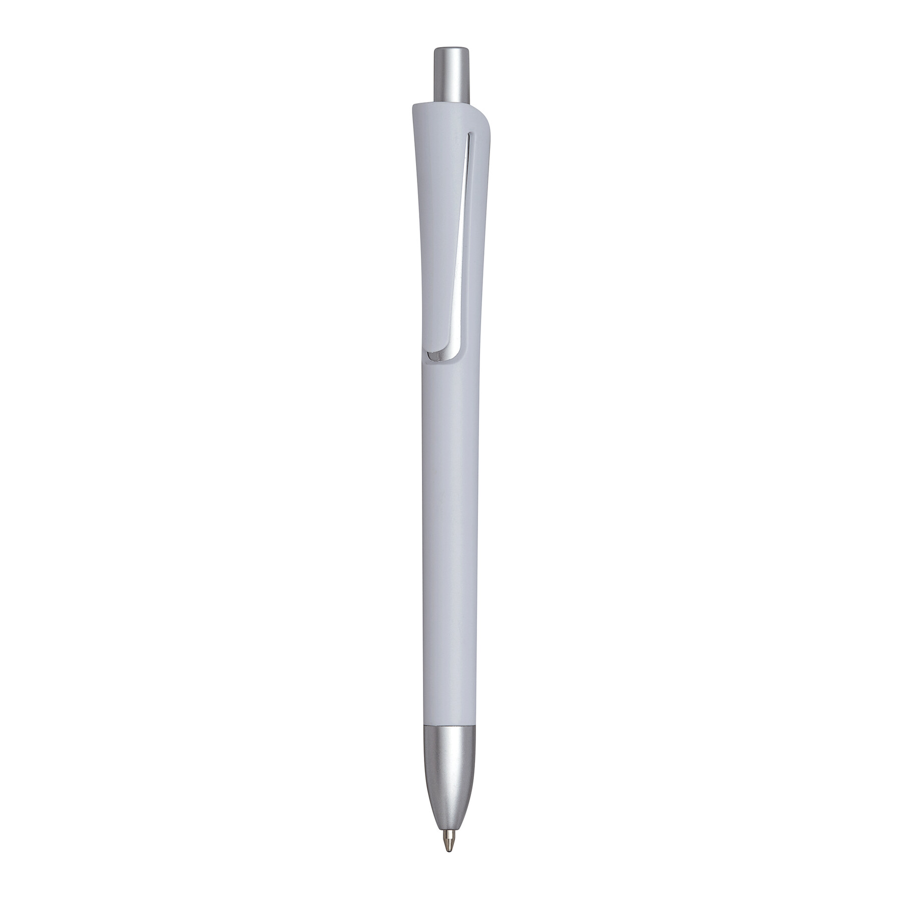 Długopis OREGON z mechanizmem przyciskowym, trzonkiem z tworzywa sztucznego, matowo-srebrnym akcentem pod klipem, na przycisku i obsadce, długość pisania około 800 - 1000 m, czarny tusz.