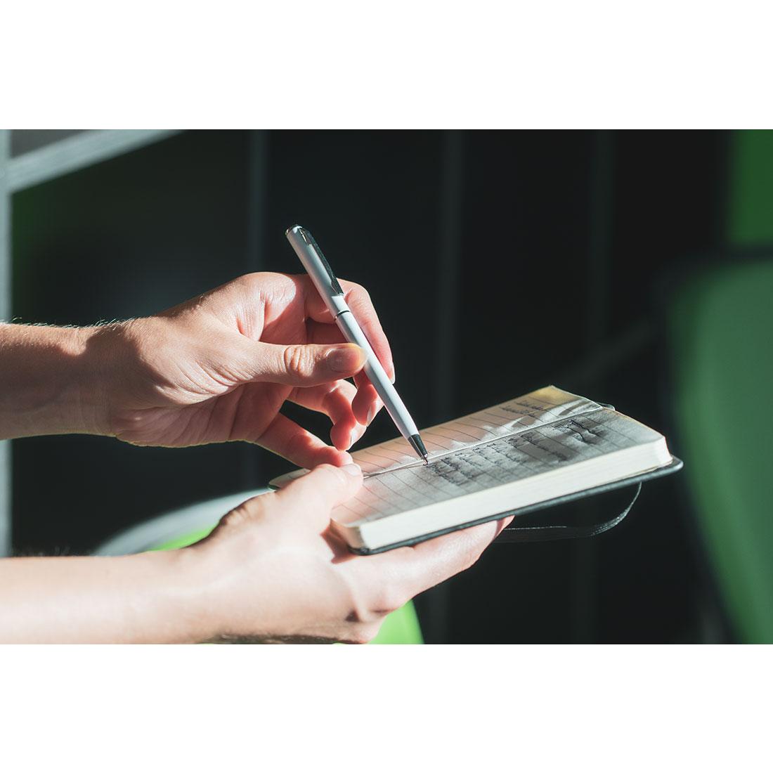 Smukły długopis plastikowy z mechanizmem obrotowym i wkładem piszącym na niebiesko.