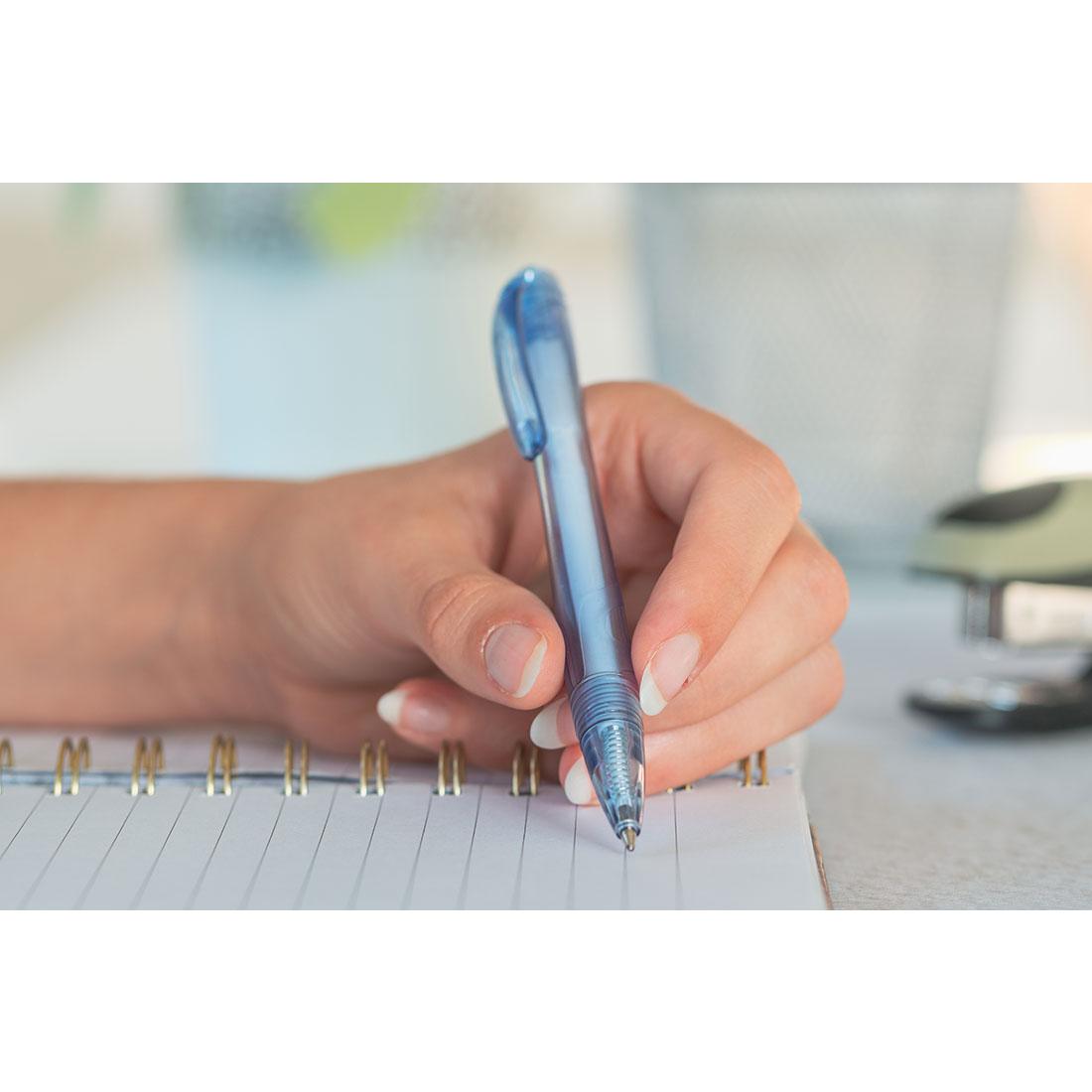 Przyjazny dla środowiska długopis wykonany z półprzeźroczystego plastiku PET pochodzącego z recyklingu. Długopis posiada niebieski wkład.