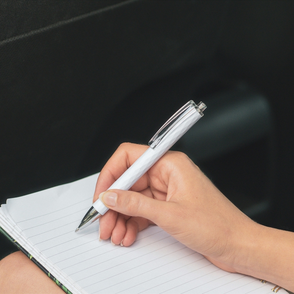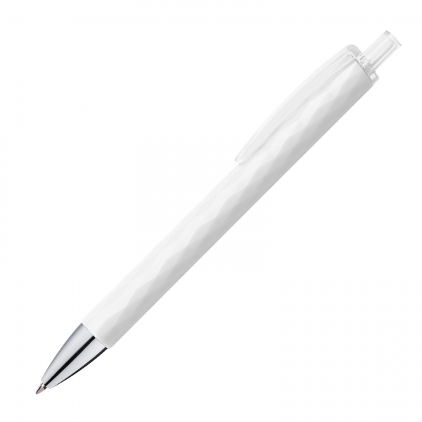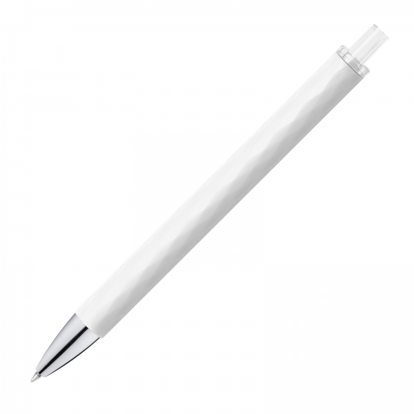 Plastikowy długopis z oryginalnym korpusem i dużym wkładem piszącym na niebiesko.