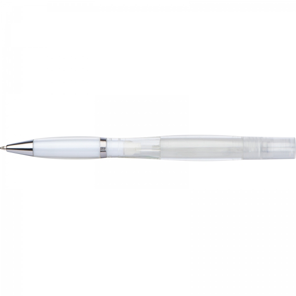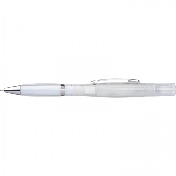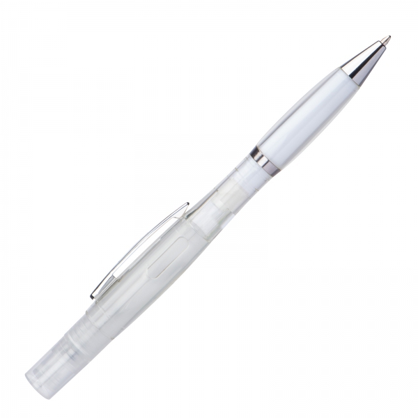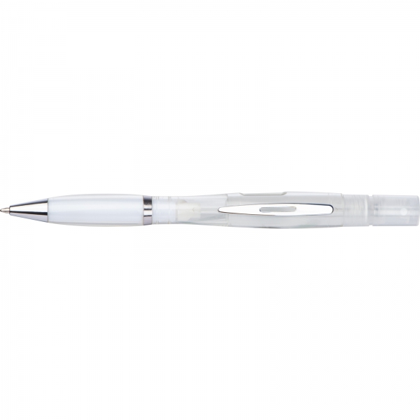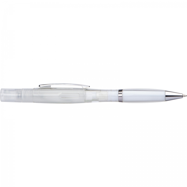 Plastikowy długopis z przekręcanym mechanizmem i wkładem piszącym na niebiesko, posiada atomizer do płynu dezynfekującego lub perfum.