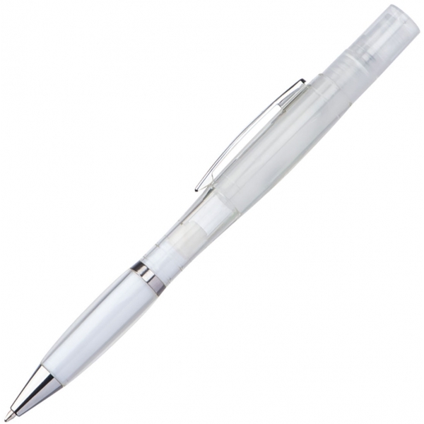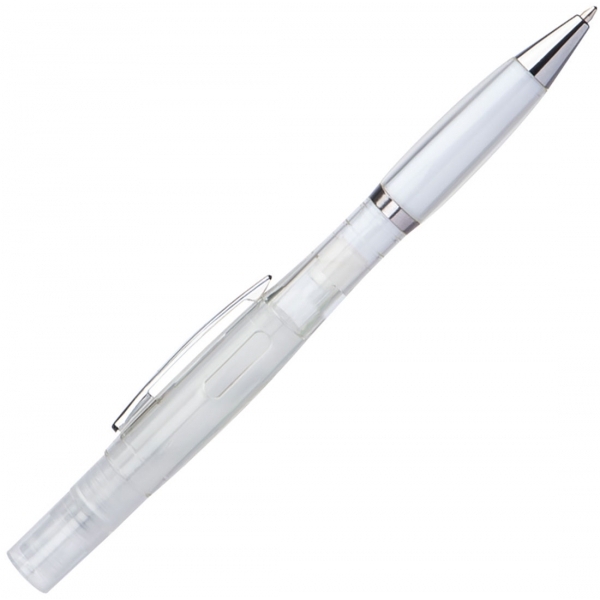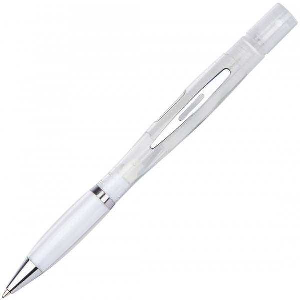 Półprzezroczysty długopis z mechanizmem obrotowym ze srebrnymi wykończeniami i niebieskim wkładem piszącym. Spryskiwacz jest wielokrotnego użytku. Długopis dostępny w białym kolorze.