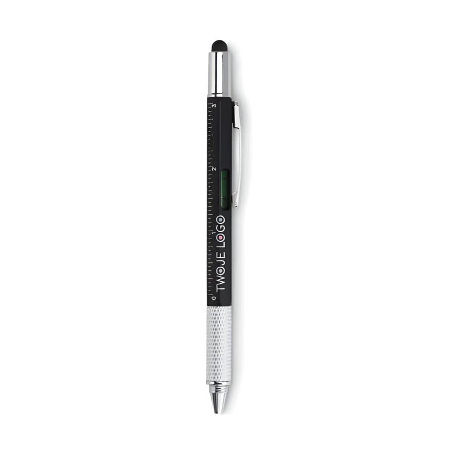 Przekręcany długopis z poziomicą, wykonany z ABS. Wyposażony w linijkę, rysik oraz podwójny śrubokręt gwiazdka i płaski. Czarny tusz.
