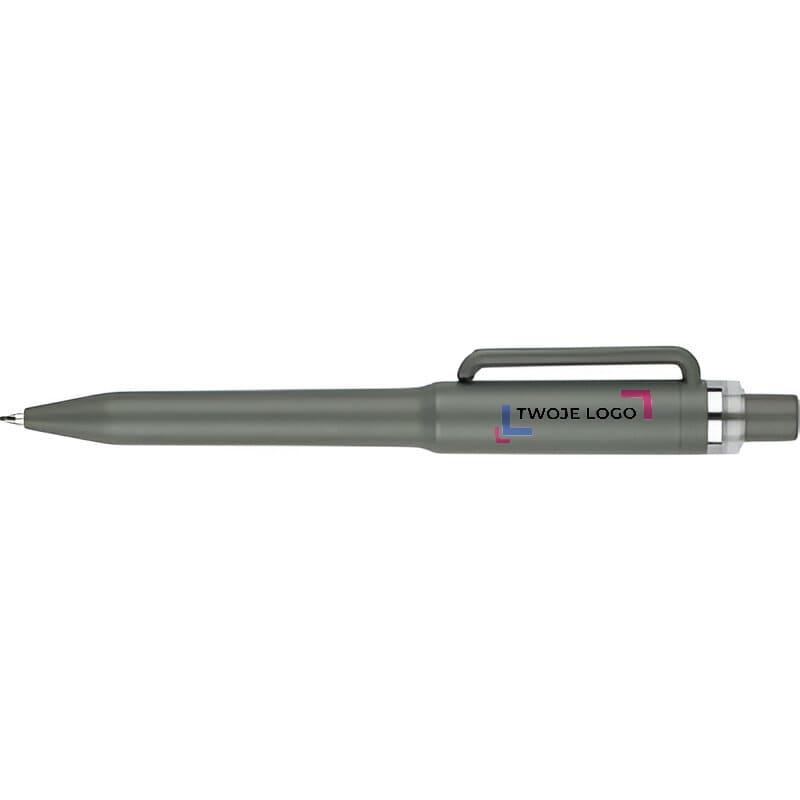 Długopis RABS, w kształcie kubka podróżnego, z metalicznym wykończeniem, wkład w niebieskim kolorze o długości pisania 800 metrów, mechanizm przyciskowy, ikona ABS z recyklingu, plastikowy przycisk, klips oraz chromowany plastikowy pierścień na górze