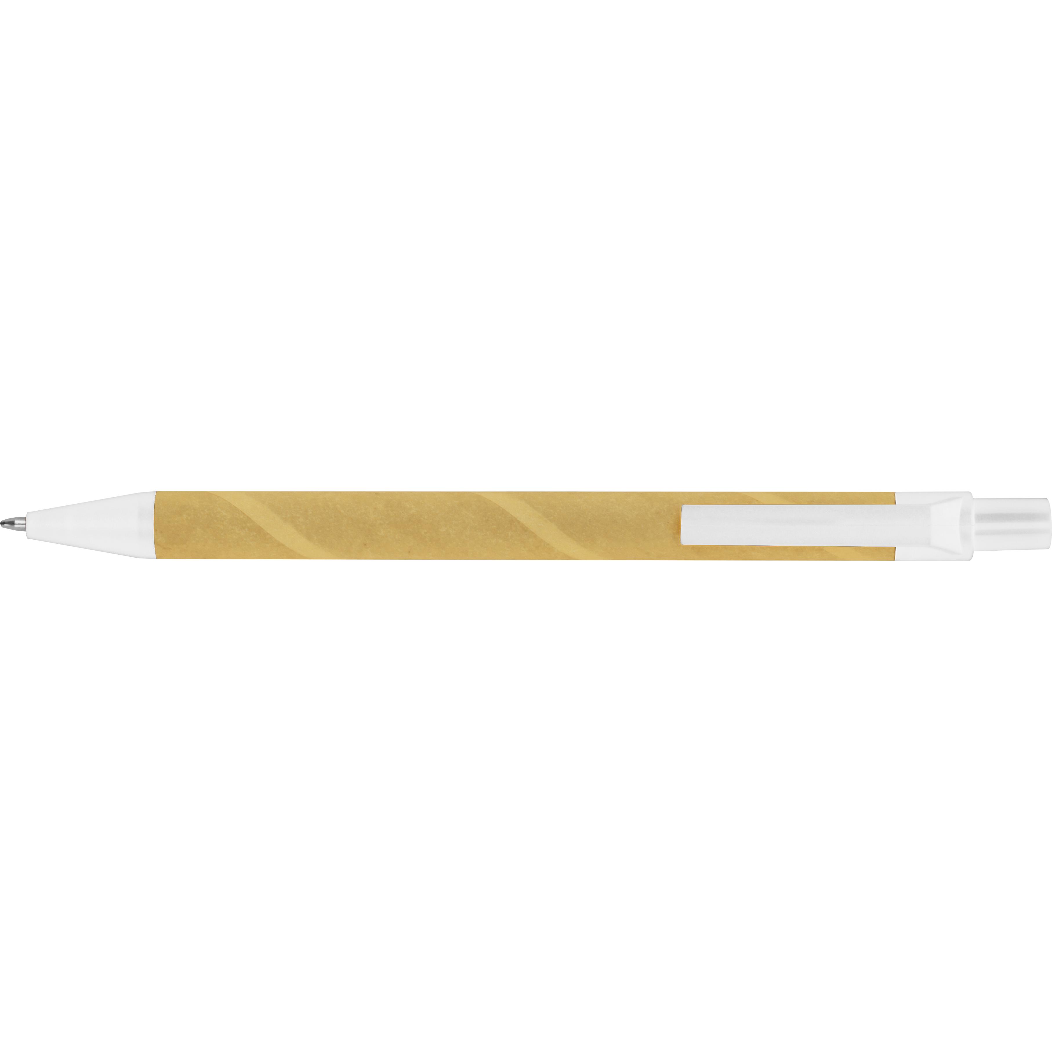 Dłuopis ekologiczny wyposażony w mechanizm autmatyczny typu `klik`. Wykonany z papieru z recyklingu, a jego kolorowe elementy z kukurydzy. Posiada wkład piszący na niebiesko.