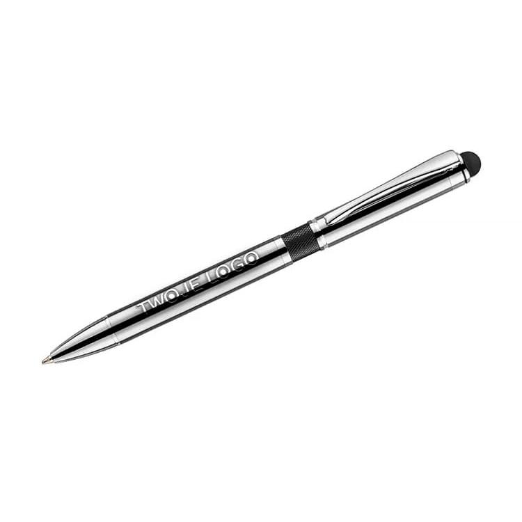 Elegancki metalowy długopis z kolorową aplikacją na korpusie oraz touchpenem.
