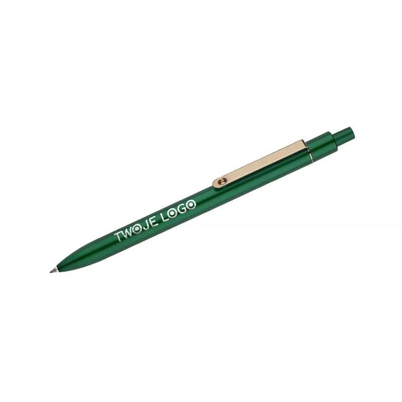 Stylowy długopis aluminiowy z matowym wykończeniem i klipem w kolorze złotym.