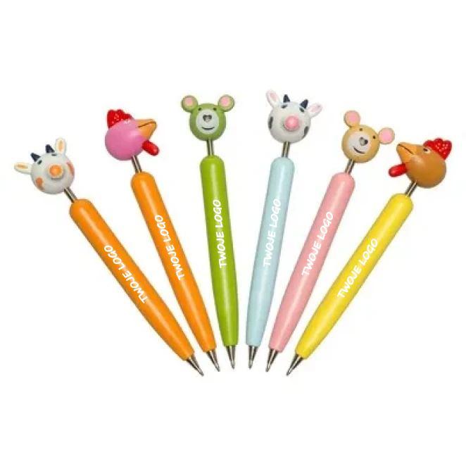 Długopis "zwierzątko" z kolorowym trzonem, występuje w 6 różnych wzorach sprzedawanych losowo, wkład w niebieskim kolorze, produkt wykonany z drewna i żelaza