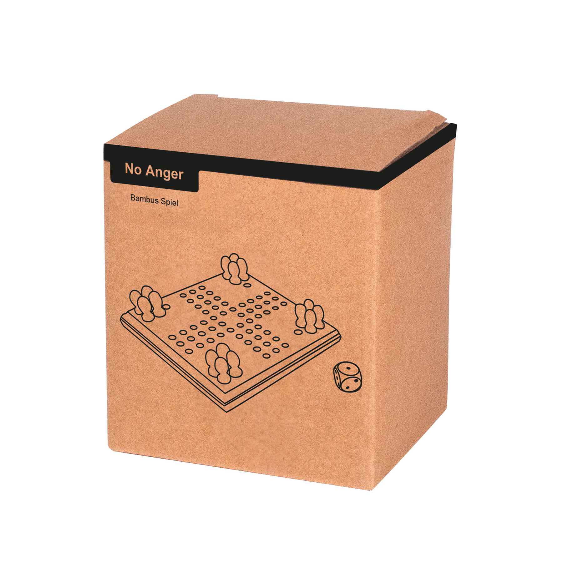 Drewniana gra NO ANGER. Zestaw składa się z bambusowej planszy, 16 elementów do gry i drewnianych kości . Dostępna w przyjaznej dla środowiska bawełnianej torbie.
