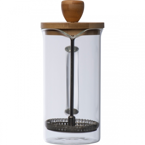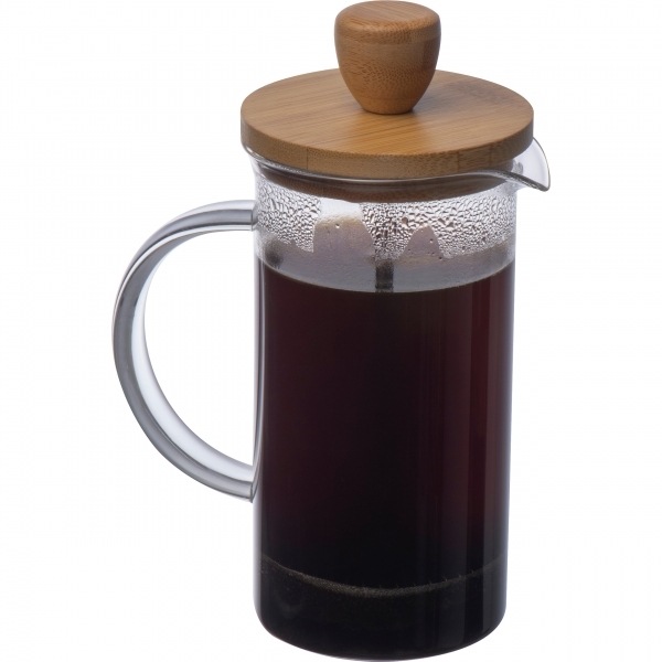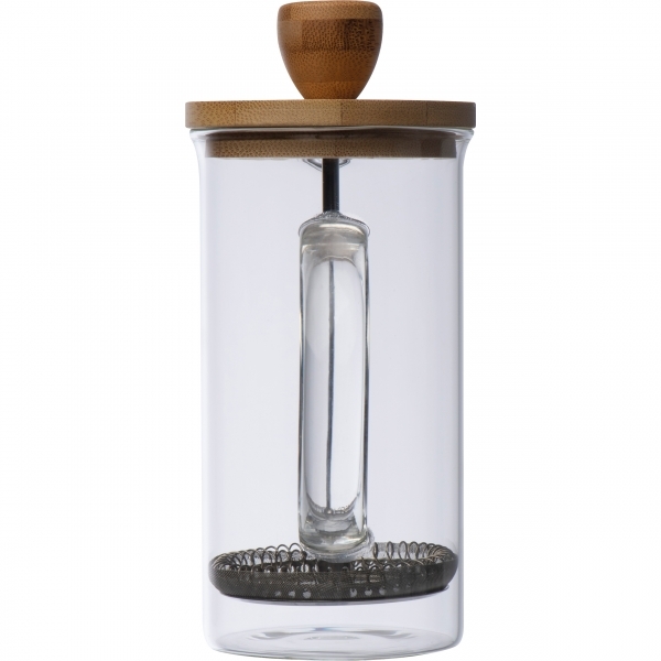 Zparzacz do kawy wykonany ze szkła borokrzemianowego z bambusowym wieczkiem. Pojemność 350 ml.
