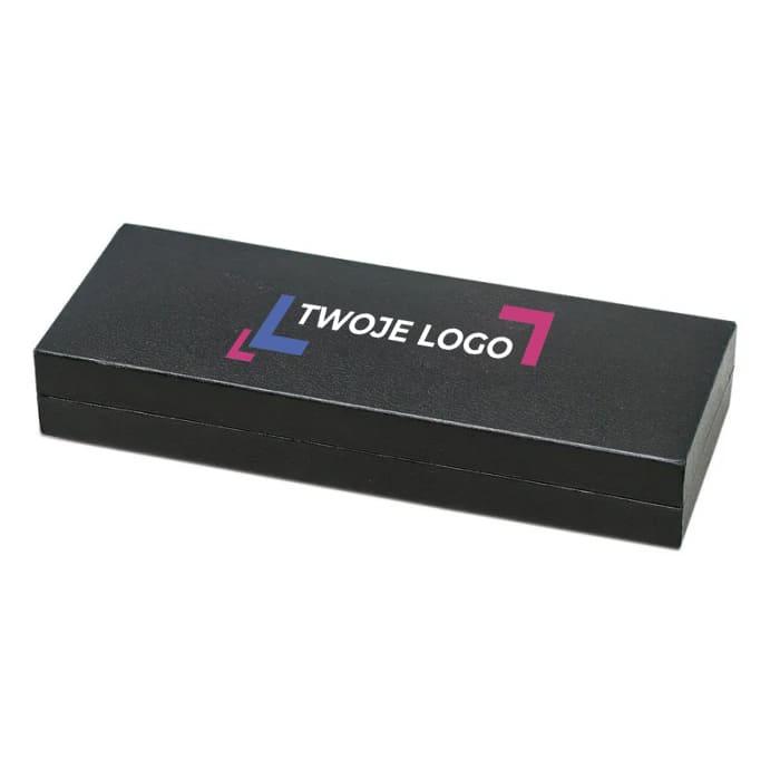 Eleganckie etui na artykuły piśmiennicze wykonane z czarnego papieru ozdobnego pokrytego folią. Wnętrze wyłożone jest białą tkaniną, która pięknie eksponuje artykuły piśmiennicze. Logo nadrukujemy na wieczku. Pasuje do wszystkich modeli długopisów.