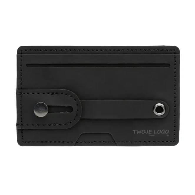 Etui na karty kredytowe 3 w 1, stojak na telefon, uchwyt do telefonu, ochrona RFID, mieści do 2 kart, wykonane z PU, posiada taśmę umożliwiającą przyczepienie do płaskiej powierzchni telefonu, po wysunięciu paska działa jako uchwyt lub stojak na telefon, ślad węglowy produktu: 0,09 kg CO2