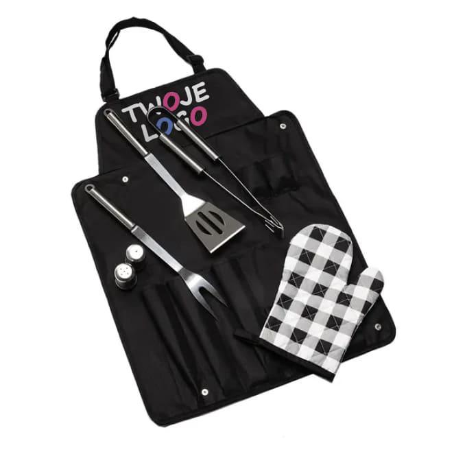 Nylonowy fartuch grillowy z 7-elementowym wyposażeniem. Wykonany z metalu oraz nylonu.