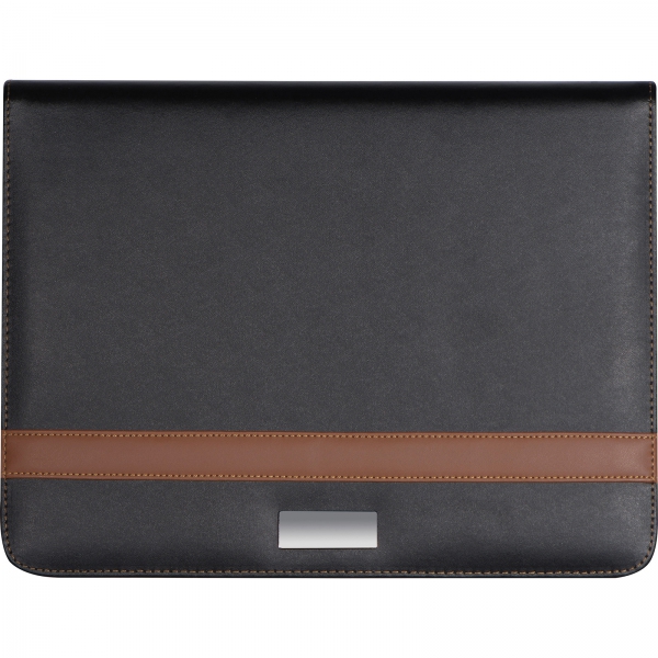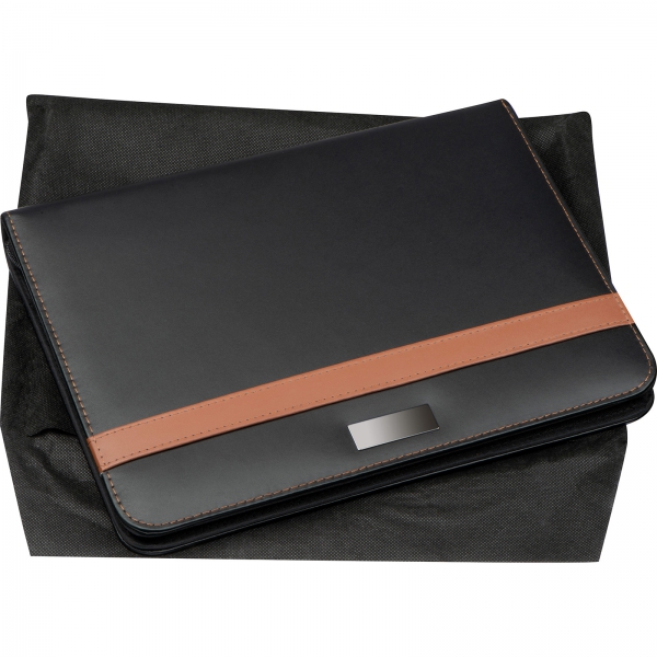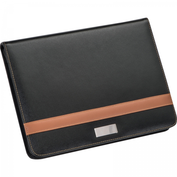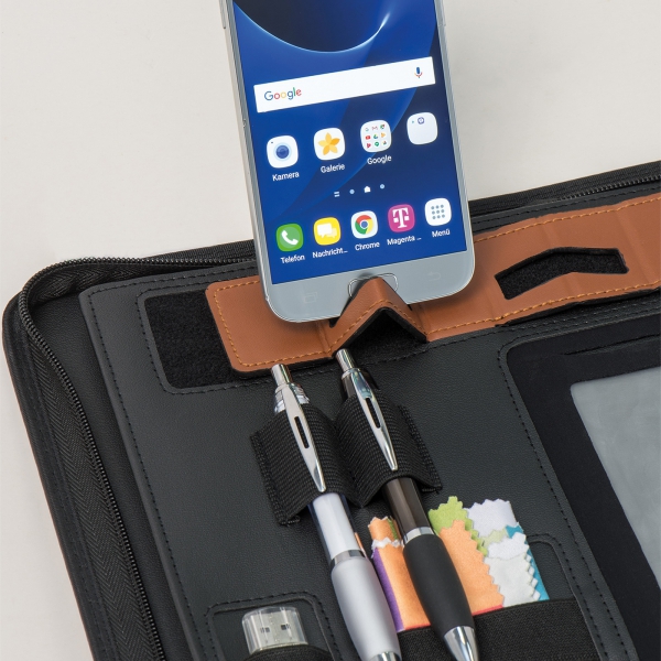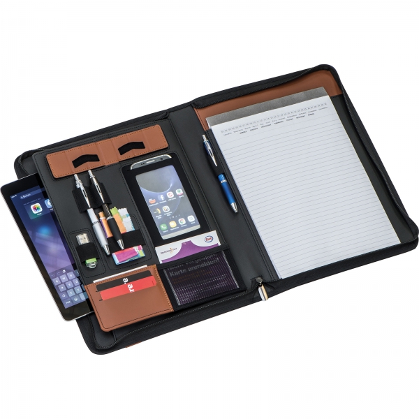 Folder A4 z materiału imitującego skórę. Posiada liczne przegródki, kieszeń i podstawkę pod telefon, miejsce na długopis oraz notes w linie z małym kalendarzem.