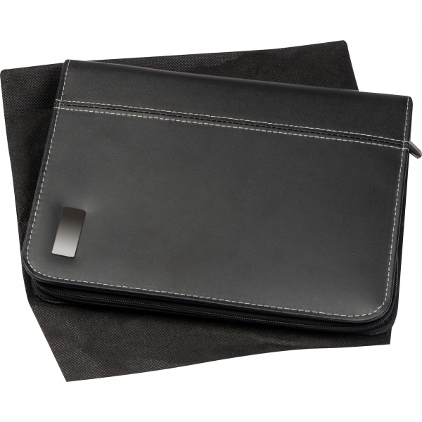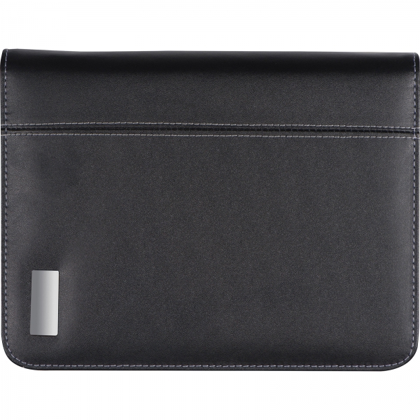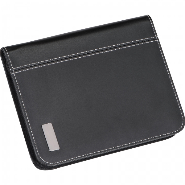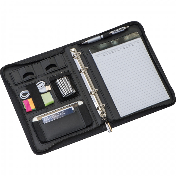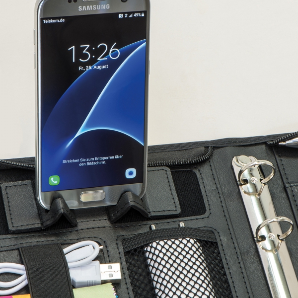Folder A5 z wysokiej jakości skóry mielonej. Posiada segregator, liczne kieszenie na wizytówki, kieszeń i podstawkę pod telefon oraz notes w linie z małym kalendarzem. Zamykany na zamek.