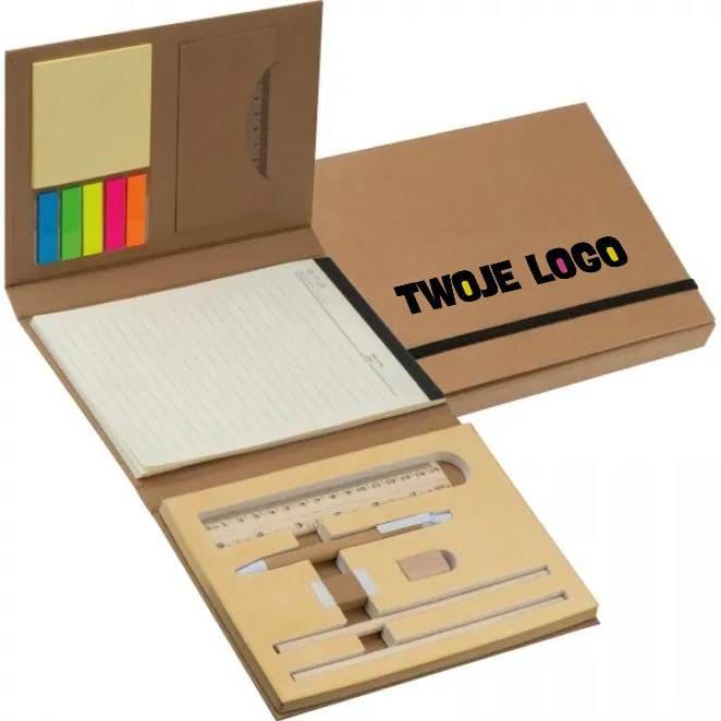 Podwójnie składany, zamykany na gumkę tekturowy folder zawiera: 80-stronicowy notes w linie, 20 kolorowych samoprzylepnych karteczek w 5 kolorach, żółte karteczki, dwie linijki (w tym jedna drewniana), długopis, drewnianą temperówkę, gumkę do ścierania i dwa ołówki.