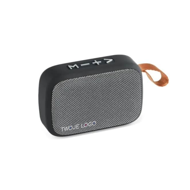 Przenośny głośnik wykonany z ABS, tkaniny poliestrowej i gumowanego wykończenia. Z bezprzewodową transmisją BT, posiada czytnik kart micro SD i wejście pomocnicze 3.5 mm. Z mocą dźwięku 3W i baterią 300 mAh, ma autonomię około 2 godzin. Umożliwia odbieranie połączeń dzięki wbudowanemu mikrofonowi, sterowanie głośnością i listą odtwarzania urządzenia mobilnego. W zestawie kabel USB-C do ładowania. Dostarczany w pudełku upominkowym. 120 x 80 x 40 mm | Pudełko: 142 x 85 x 45 mm