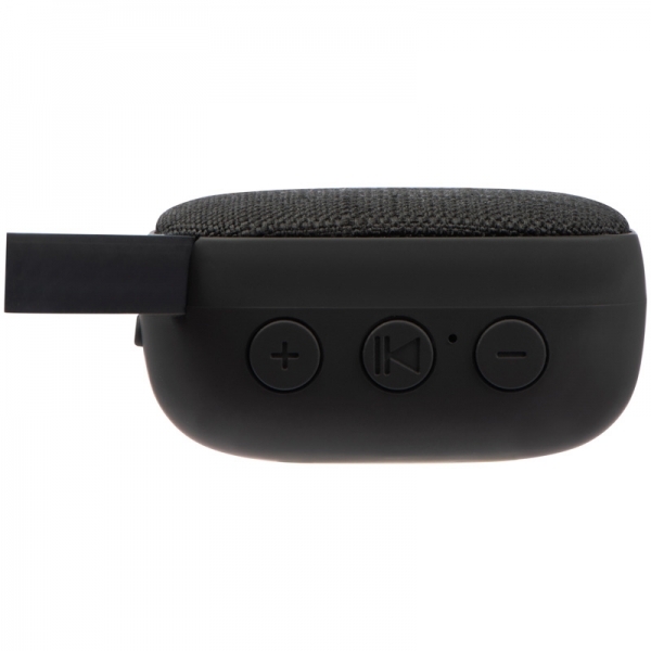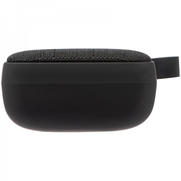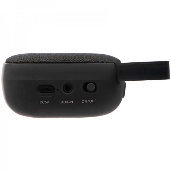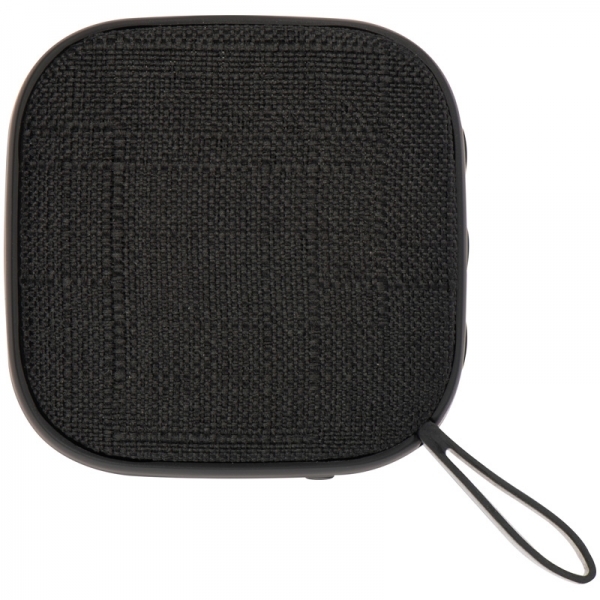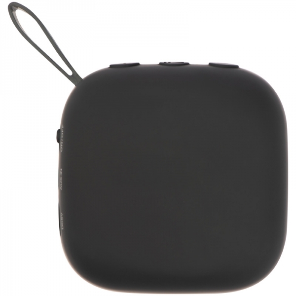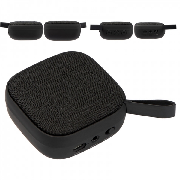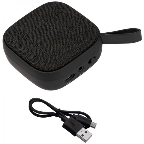 Głośnik Bluetooth w kwadratowym kształcie, gumowanej obudowie z pętelką i kabelkiem.