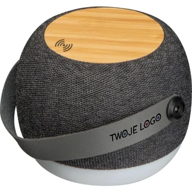 Głośnik bluetooth (bateria 1200 mAh, 5W) wykonany z materiału RPET i bambusa, z wbudowaną ładowarką indukcyjną (moc 15W). W zestawie kabel do ładowania typu C, o długości 50 cm.