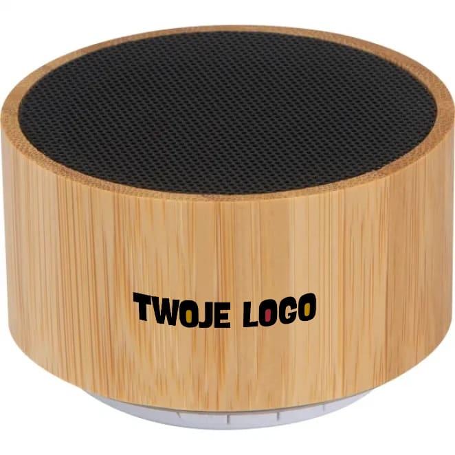 Głośnik Bluetooth z powłoką bambusową, podświetleniem od spodu, gniazdem na kartę i kablem do ładowania.