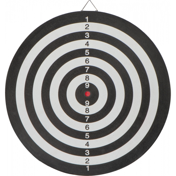 Gra w rzutki z 6 rzutkami (3 zielone, 3 czerwone). Dwustronna tarcza posiada metalową pętelkę do mocowanie na ścianie.