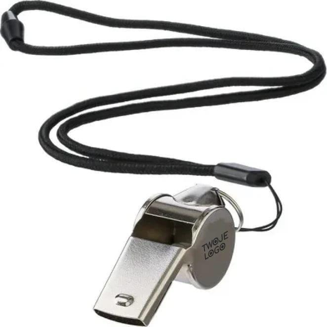 Gwizdek ze sznurkiem z poliestru, można go zawiesić na szyi albo wieszaku, wydaje głośny sygnał, zapakowany w brązowy kartonik, produkt wykonany z metalu