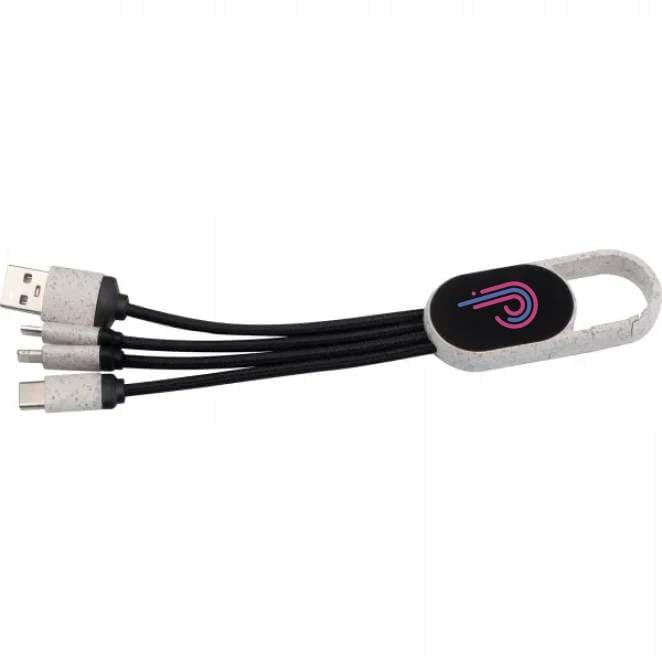 Kabelek do ładowania z włókien pochodzenia roślinnego (słoma pszenna) z kablem ładującym USB i 3 różnymi końcówkami: Micro USB, C-Type i złączem 8 pin.