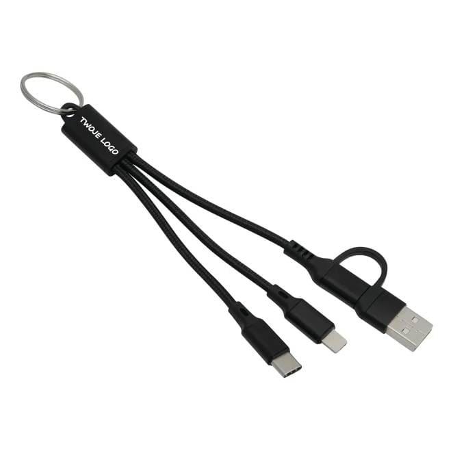 Kabel ładujący FANTAIL do ładowania urządzeń elektronicznych. Ma długość ok. 18 cm oraz breloczek na klucze. Zawiera wtyczkę wejściową USB-C, adapter do USB-A oraz 2 wtyczki do ładowania - USB-C iwtyczkę Micro-USB/Lightning.