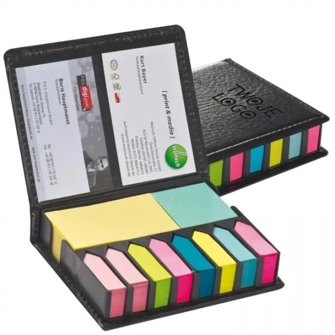 Praktyczny zestaw karteczek złożony z 200 niebieskich i żółtych karteczek oraz 8 mniejszych różnokolorowych bloczków. Całość znajduje się w etui z PU, w którym można również przechowywać np. wizytówki.