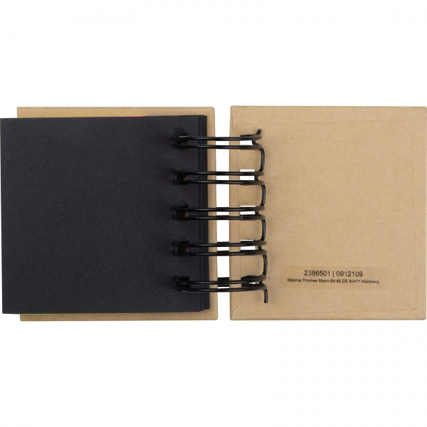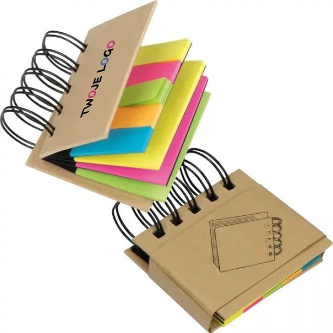 Zestaw karteczek w tekturowej okładce. Zawiera małe karteczki w 5 kolorach oraz 3 nieco większe bloczki (wszystkie samoprzylepne, po 25szt. w każdym kolorze).