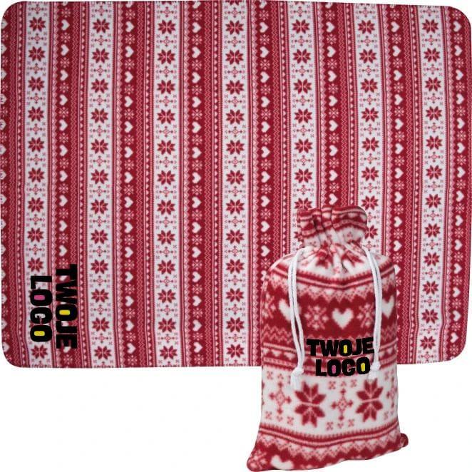 Przytulny kocyk wykonanay z polaru 200g/m², ozdobiony świątecznym wzorkiem. Koc palowany jest w dopasowany woreczek ze ściągaczami.