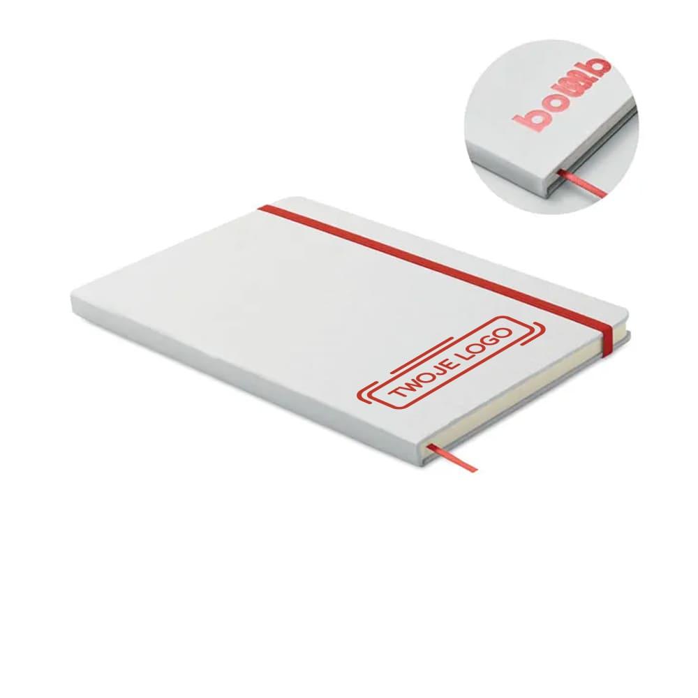 Notatnik A5 z twardą okładką wykonany w 70% z kartonu po mleku i w 30% z papieru z recyklingu. Białą okładka w kartonowej oprawie . 160 stron w linie (80 kartek). Gumka zamykająca, wstążkowa zakładka dopasowana do uwidocznionego koloru. Po grawerowaniu laserowym kolor jest widoczny.