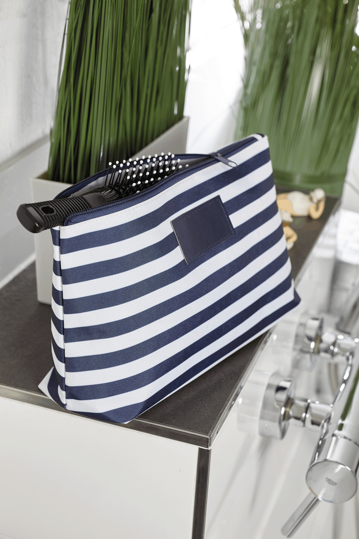 Kosmetyczka STRIPY, komora główna na zamek, wewnątrz mała kieszonka na zamek, na zewnątrz marynistyczne paski, z doskonałą do oznakowania, skóropodobną naszywką z przodu – idealna na kosmetyki i akcesoria.