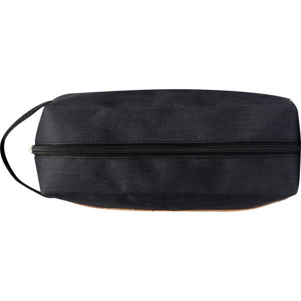 Kosmetyczka wykonana z poliestru z korkowym dnem. Kosmetyczka zamykana na zamek, wyposażona w wygodną rączkę ułatwiającą transport.