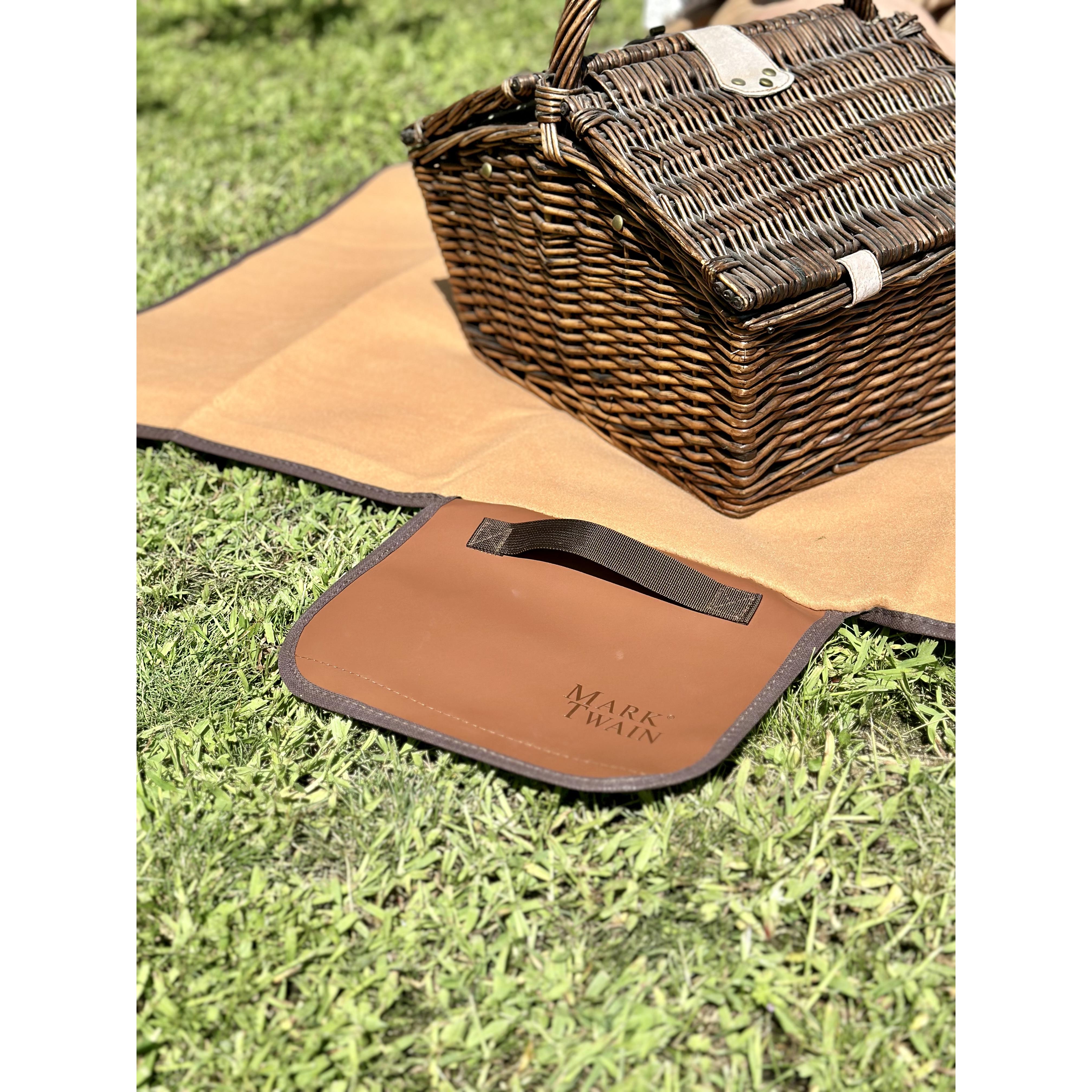 Koszyk piknikowy dla dwóch osób, zaopatrzony w plastikowe kieliszki, porcelanowe talerze, sztućce oraz nóż kelnerski, a także komorę chłodzącą.