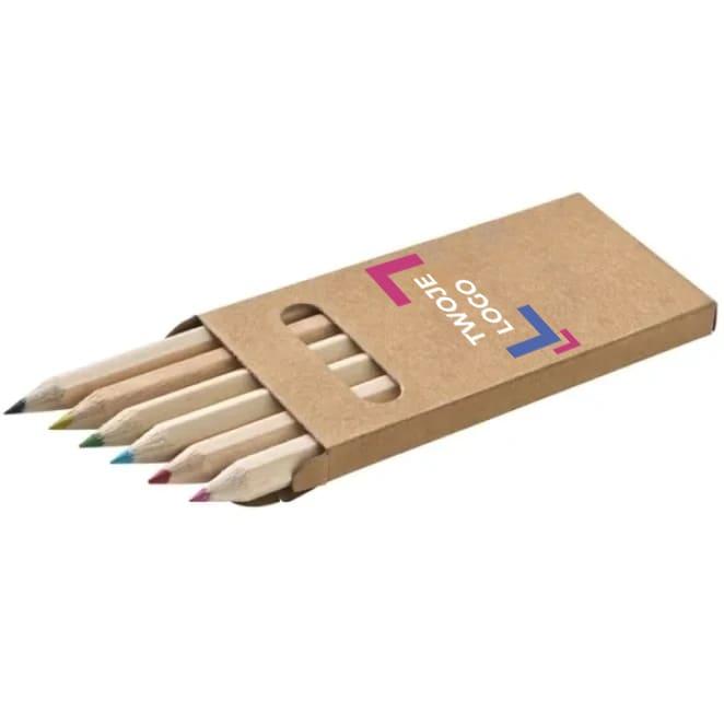 Zestaw kredek drewnianych mini, który zawiera 6 sztuk, zapakowany w tekturowym opakowaniu.