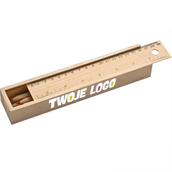 Zestaw 8 drewnianych kredek. Wysuwane wieczko drewnianego pudełka jest jednocześnie linijką z podziałką w centymetrach i calach.
