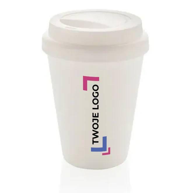 Kubek termiczny 300 ml, lekki, trwały i wielokrotnego użytku, wykonany z materiału PP w 100% nadającego się do recyklingu, podwójne ścianki, zakręcane wieczko, odporny na temperaturę do 100 stopni Celsjusza, wyłącznie mycie ręczne, ślad węglowy produktu: 0,36 kg CO2