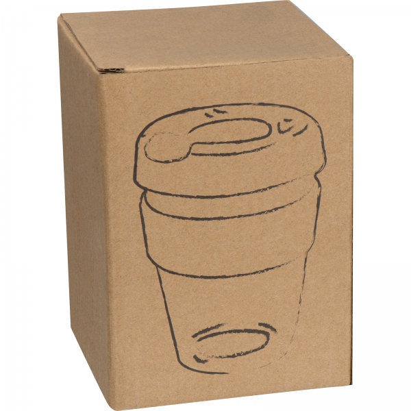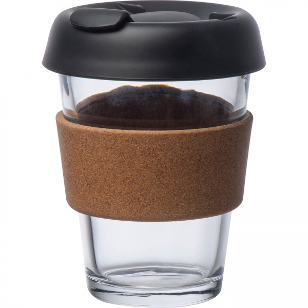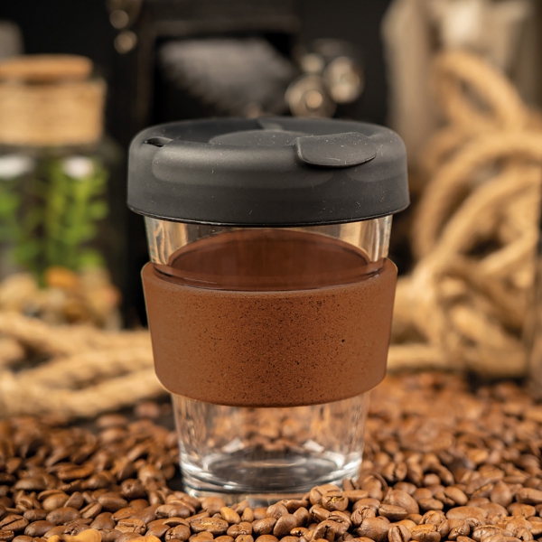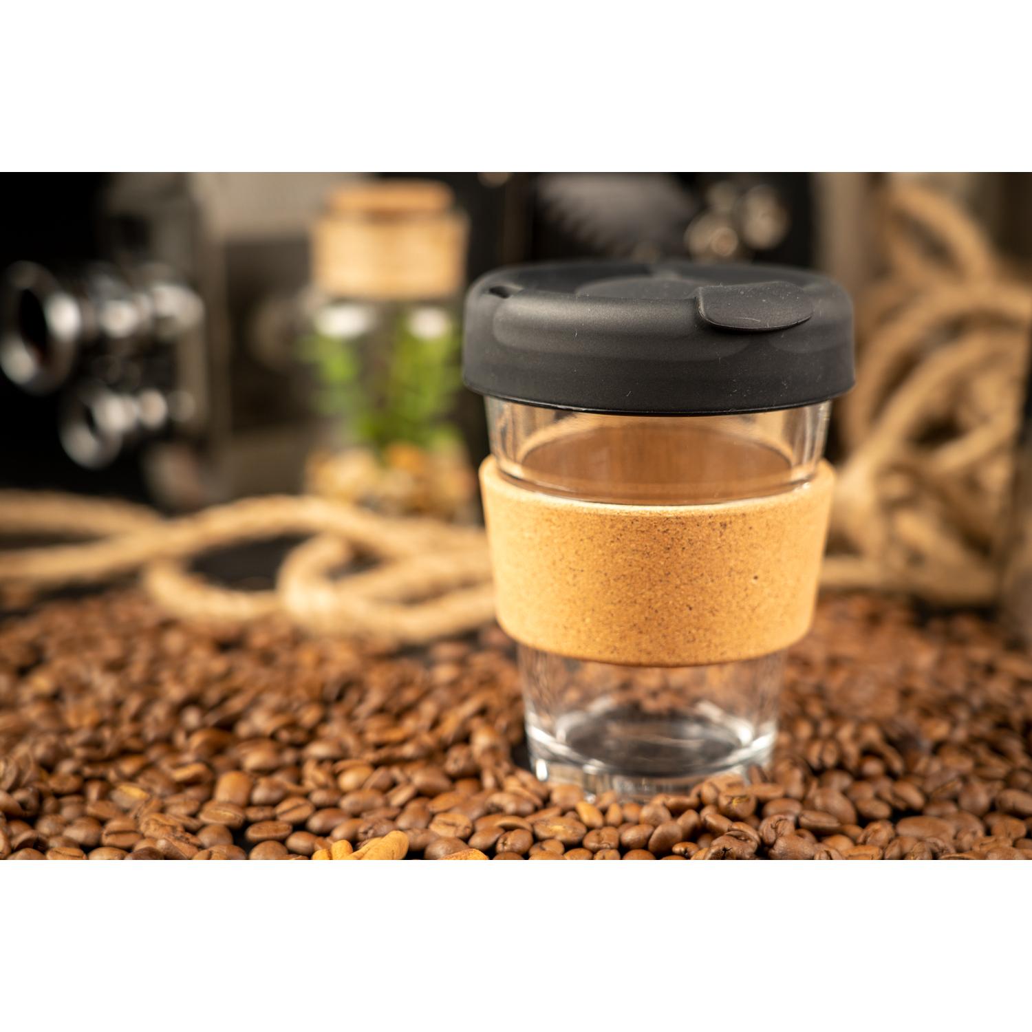 Kubek wykonany ze szkła borokrzemowego, posiada plastikowe wieczko oraz korkowy rękaw chroniący przed poparzeniem. Pojemność 350 ml.