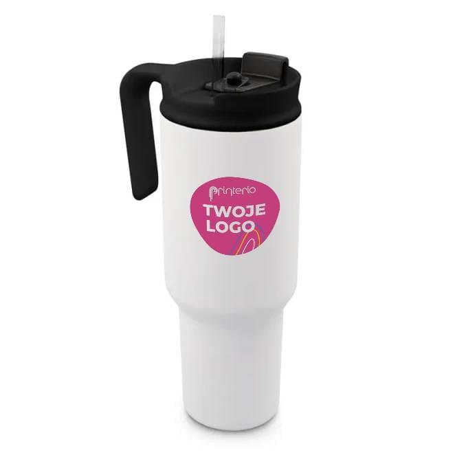 Kubek termiczny 1100 ml Air Gifts ze słomką i ergonomicznym uchwytem, zaprojektowany specjalnie pod technologię znakowania UV360, posiada podwójne ścianki ze stali nierdzewnej z próżnią między ściankami, co spowalnia oddawanie temperatury na zewnątrz, zachowując funkcje termosu, produkt wykonany ze stali nierdzewnej i plastiku, utrzymuje temperaturę napojów gorących do 15 godzin +leakproof