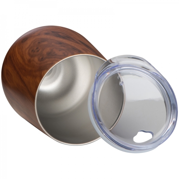 Kubek o podwójnych ściankach wykonany ze stali nierdzewnej. Posiada pokrywkę z ustnikiem wykonaną z silikonu. Wykończenie imitujące drewno. Pojemność kubka 380ml.