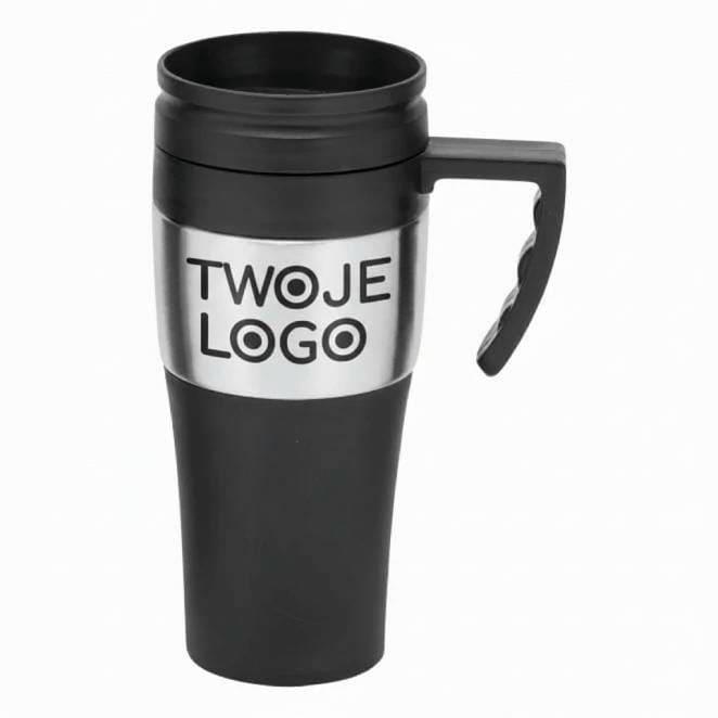 Kubek termiczny HOT DRINK z pierścieniem ze stali nierdzewnej na zewnątrz i plastikiem wewnątrz, z uszczelnianym wieczkiem i otworem do picia w wieczku, z uchem, ok. 400 ml.