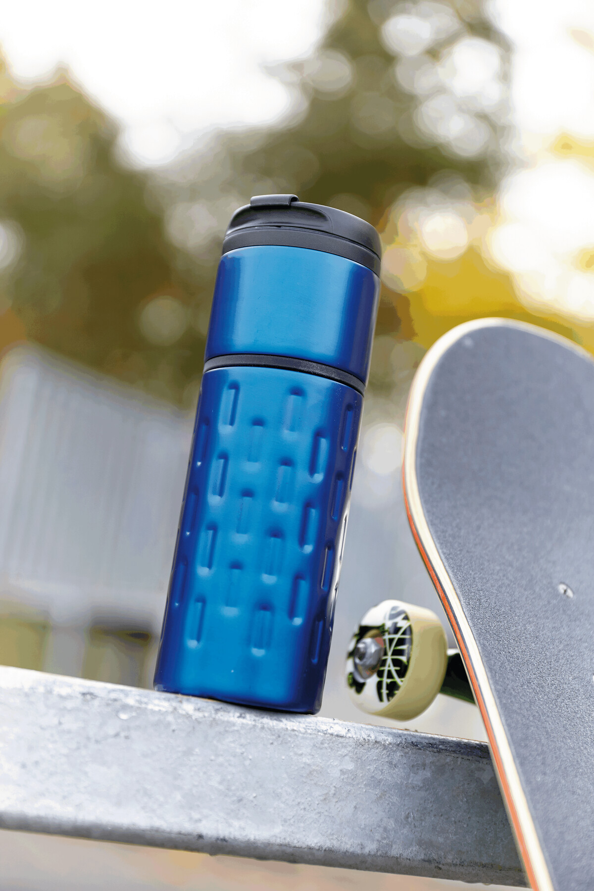 Kubek termiczny o podwójnych ściankach EXCLUSIVE LIQUID. Na zewnątrz stal nierdzewna o futurystycznym wzornictwie z silikonowym pierścieniem, wewnątrz plastik, odkręcana plastikowa pokrywa z wbudowanym, składanym otworem do picia, gumowany spód dla lepszej przyczepności, pojemność ok. 400 ml.
