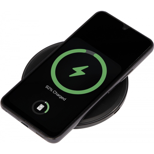 Ładowarka bezprzewodowa z fukcją szybkiego ładowania (10 watt) i ledowym wyświetlaczem. Gdy ładowarka jest gotowa do ładowania podświetla się na zielono, podczas ładowania światełko zmienia się na niebieskie.