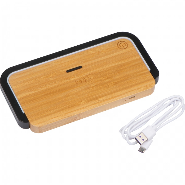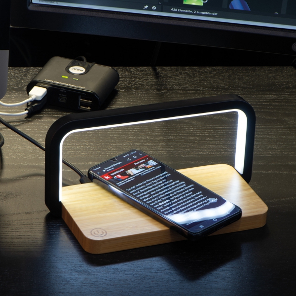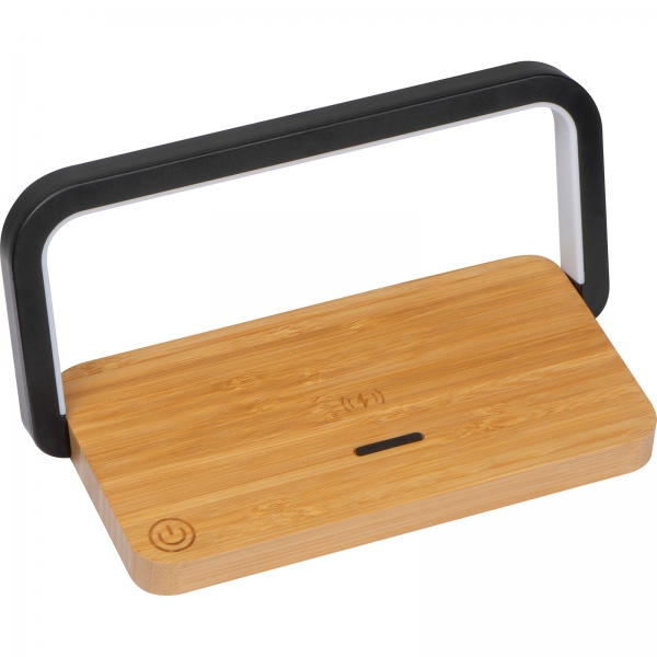 Bambusowa ładowarka bezprzewodowa o mocy 10 wat z lampką. Kompatybilna z urządzeniami z funkcją QI.Urządzenie można wykorzystywać do jednoczesnego ładowania telefonu i jako lampkę nocną.