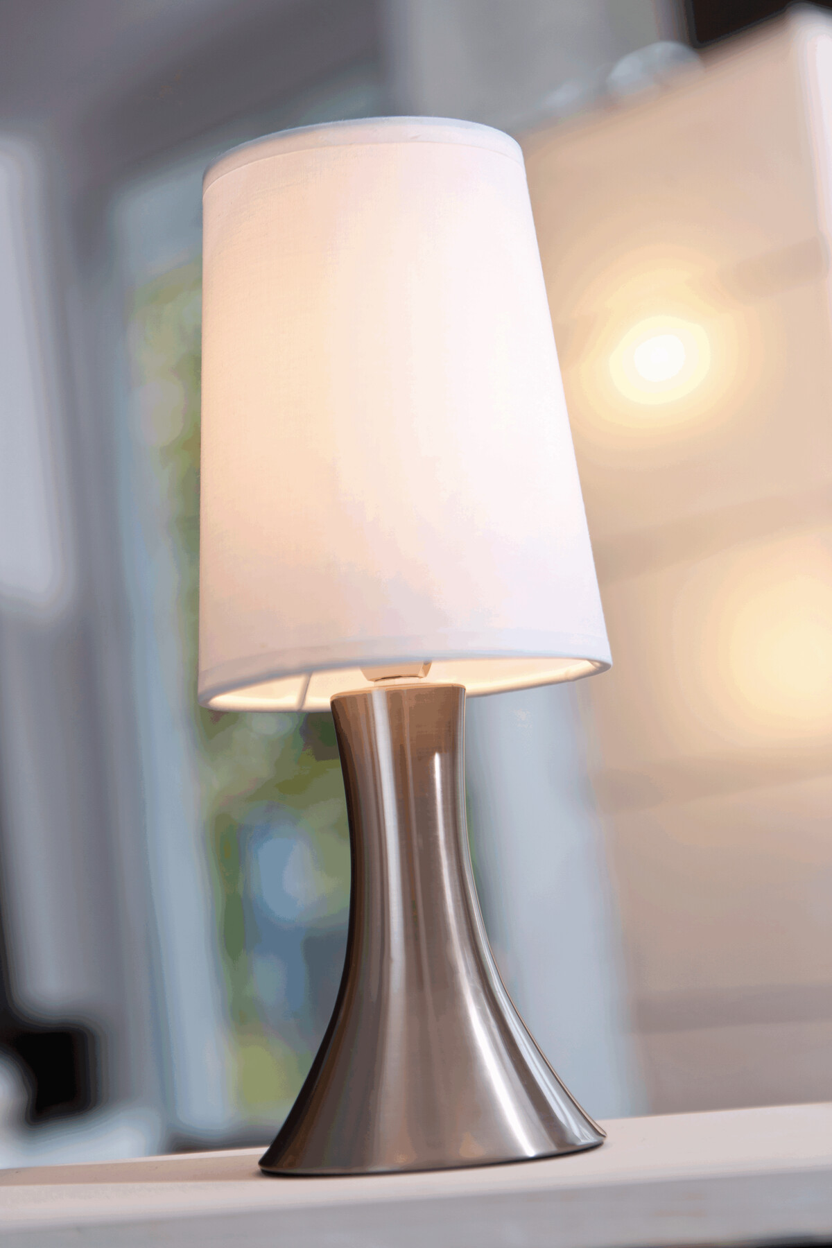 Lampa TOUCH ME z panelem dotykowym i 3-stopniową regulacją jasności światła. Biały abażur, zasilanie 230 V.