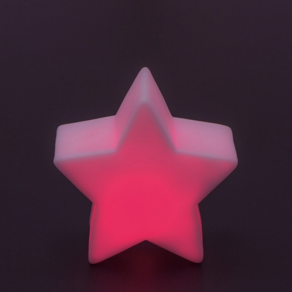 Biała, plastikowa lampka LED w kształcie gwiazdki zmieniająca kolory. Lampka zawiera 3 baterie.