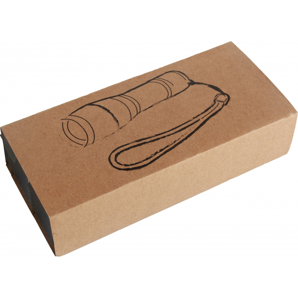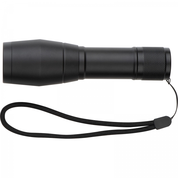Aluminiowa latarka LED o mocy 10W z 3 trybami świecenia (światło stałe, migające i SOS). Wyposażona w pasek na rękę. Produkt zawiera baterie.
