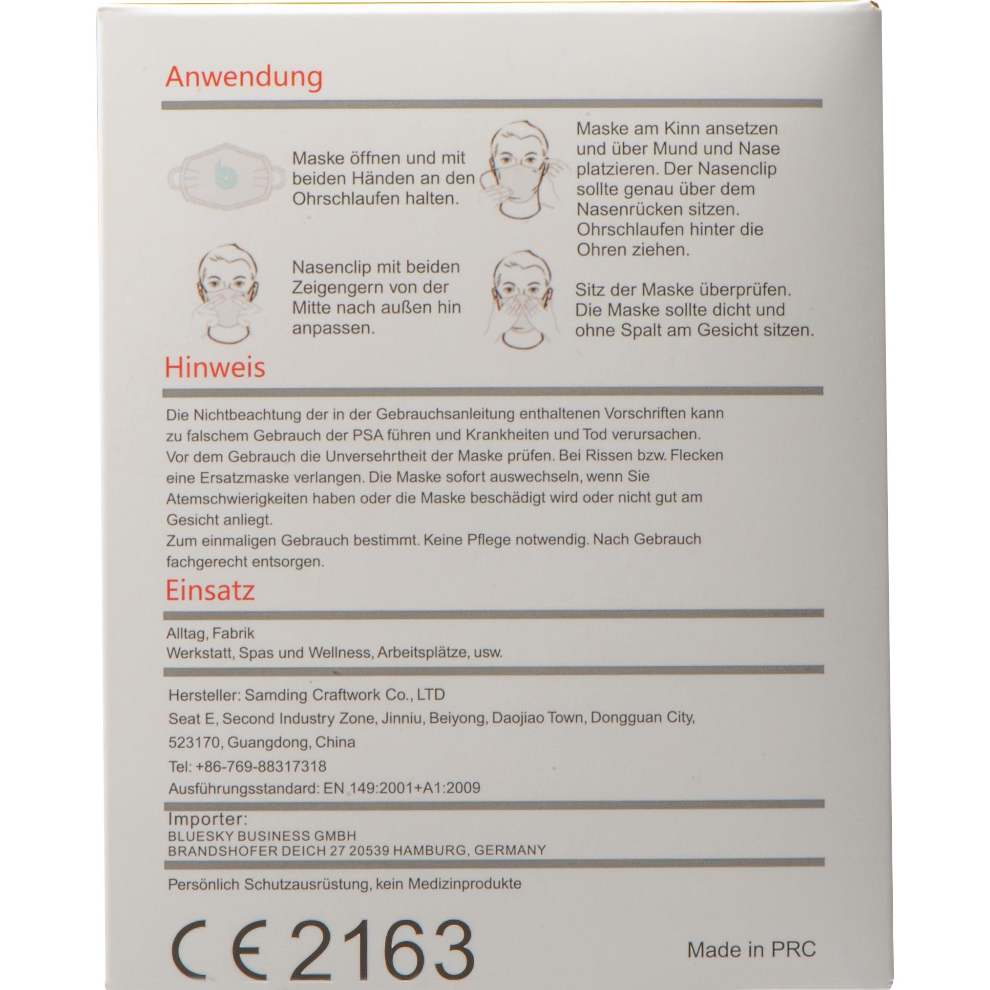 Maska ochronna 5-warstwowa, posiada dwie gumowe pętle na uszy i zintegrowany klips na nos, który pozwala lepiej dopasować ją do kształtu twarzy. Wykonana z włókniny, polaru „meltblown” oraz bawełny. Maska FFP2 zgodna z normą EN149:2001 + A1:2009.